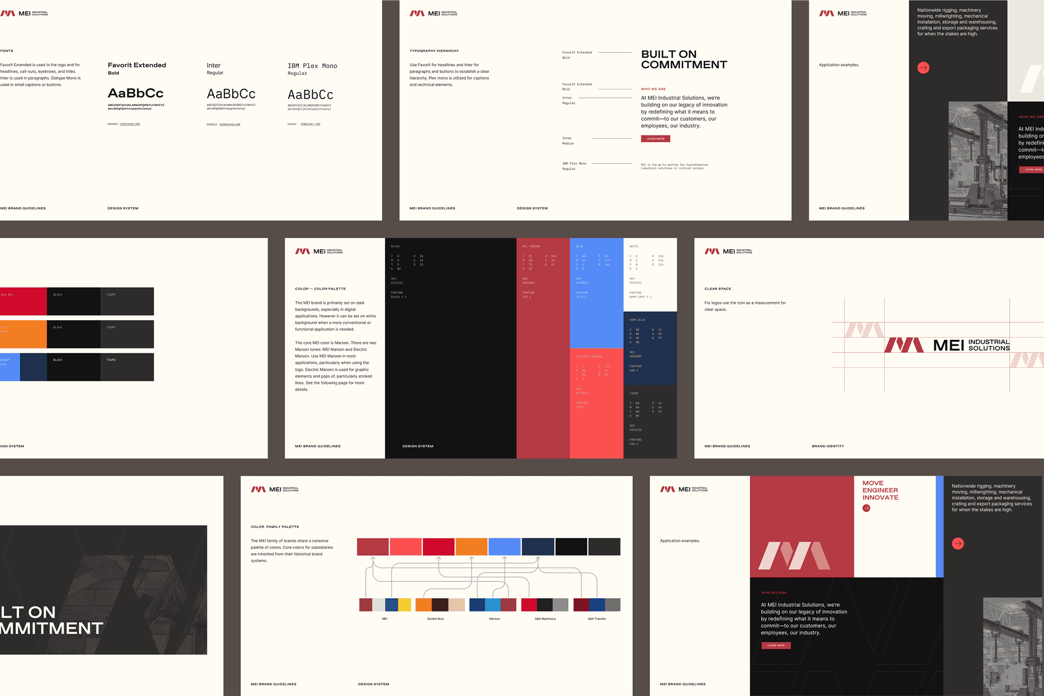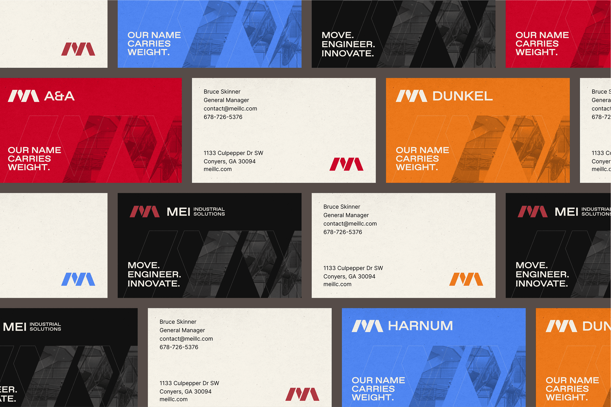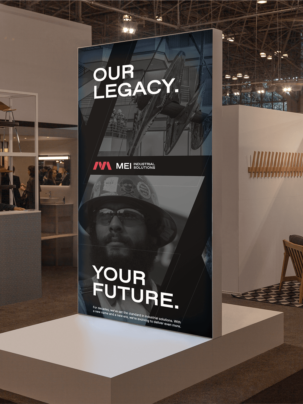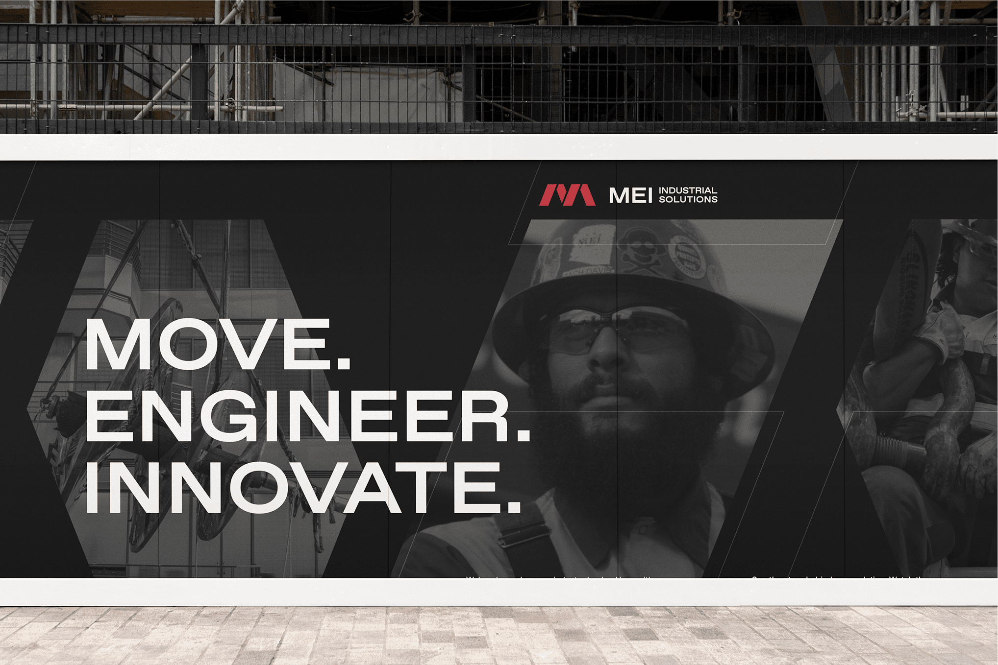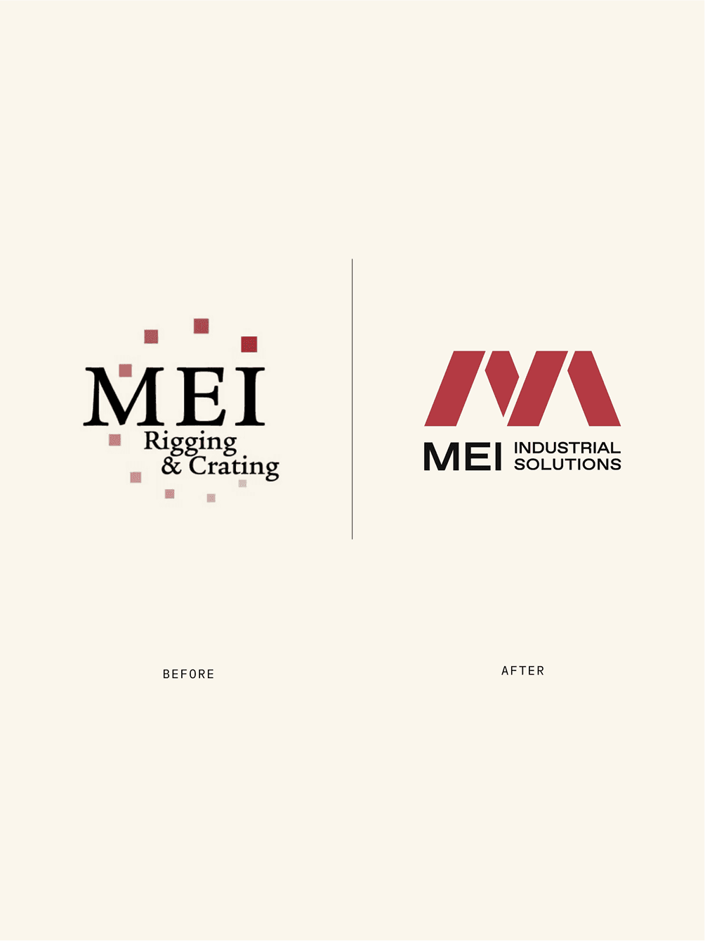 We built MEI an identity system designed for mass recognition. The new logo draws inspiration from industrial crane rigging—simple, functional, unmistakably connected to what they do. Combined with a cohesive visual language that unifies MEI Industrial Solutions with various subsidiaries, the brand is built for simplicity and scale. As MEI continues expanding across North America, their identity is now positioned to become the symbol people recognize when they think of industrial solutions done right.